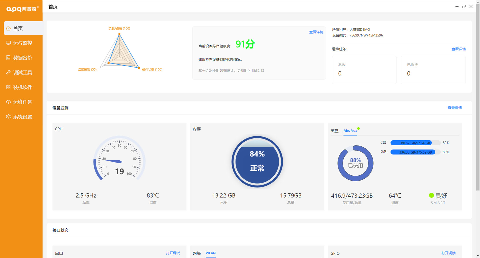 | 支持對IPC硬件狀態進行監測,支持本地存儲。 | 從IPC多維度動態計算健康評分,精準定位潛在故障點 | 支持創建備份任務,支持配置任務名稱,備份源位置、鏡像存放位置 | 具備串口及GPIO調試工具 | 搭配IPC大管家,能夠將設備監測數據及異常事件上傳到IPC大管家 |
